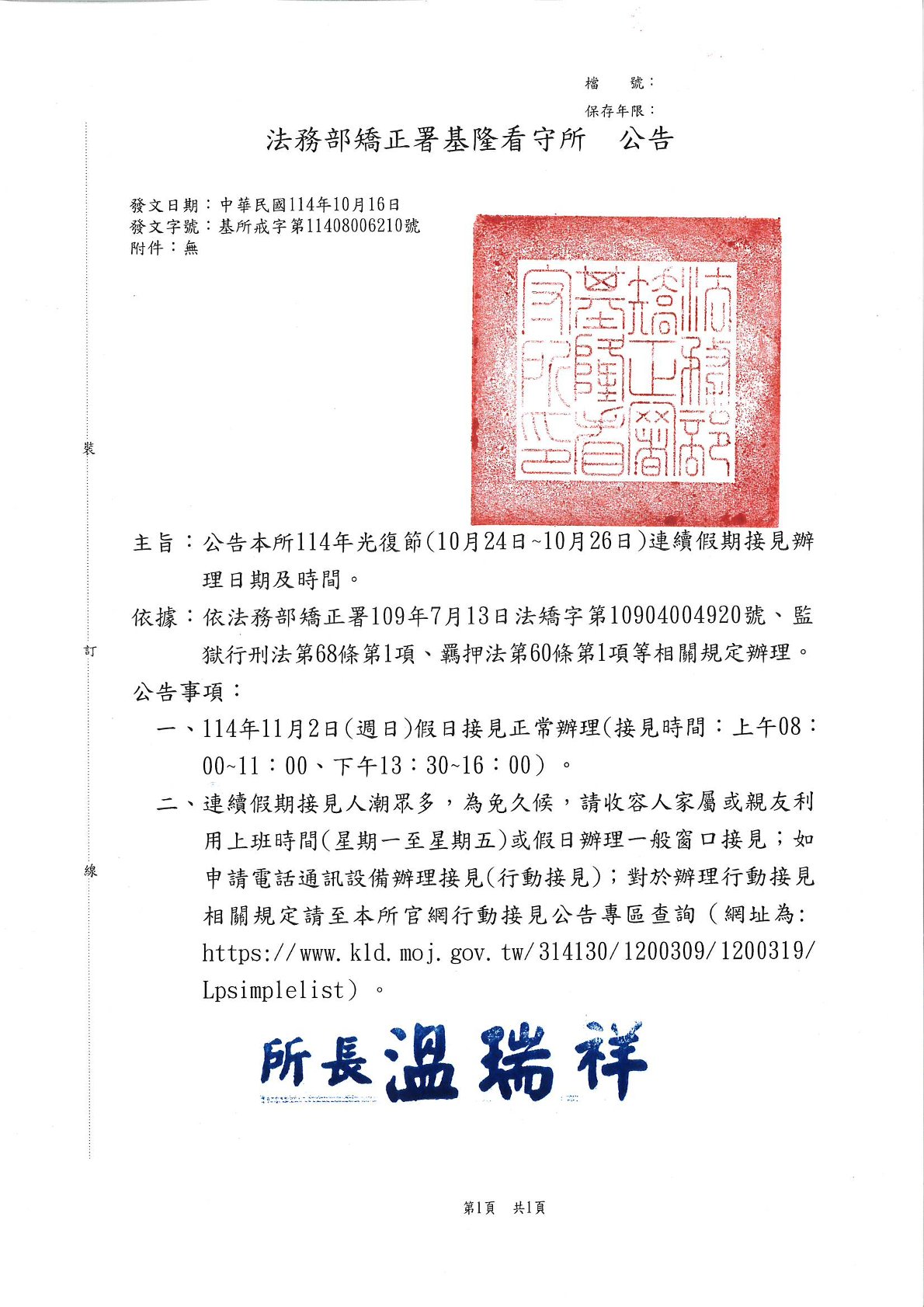 - 11 公告本所114年教師節(9月27日~9月29日)、中秋節(10月4日~10月6日)、國慶(10月10日~10月12日)連續假期接見辦理日期及時間。