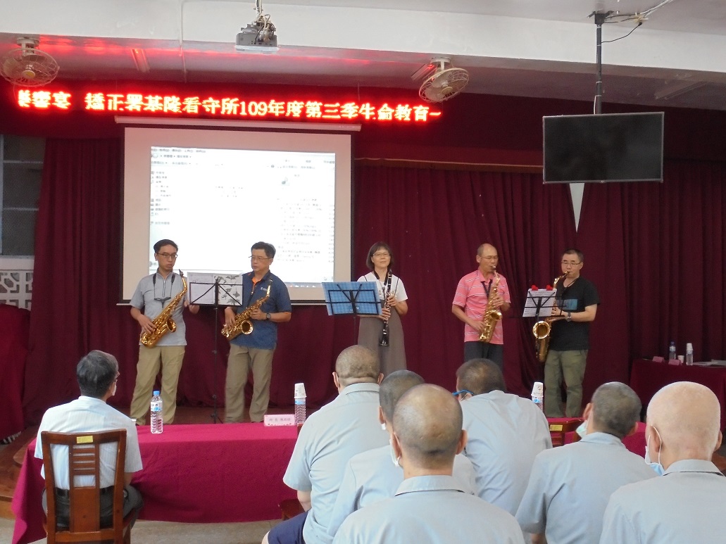 節目一開始陳所長感謝愛玩薩克斯風樂玩的無私付出,為收容人帶來美好的音樂響宴。而該樂團亦帶來二十幾首國內外膾炙人口的音樂,尤其彈奏國內的音樂時,更令與會人員朗朗上口,台上台下溶為一體,充滿和諧。本所希望透過音樂給人的力量與勇氣,找到人生前進的力量,達到出所後改過向善的目的。此次活動計有職員12名、收容人43名參加。